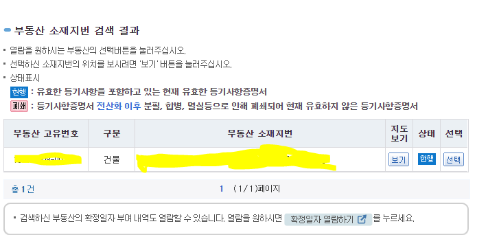 또한 건물동수의 경우에는 도움말을 참고해주시고 똑같이 따라해서 내 주소에 적용해주시면 쉽게 검색이 잘 됩니다. 검색을 누르시면 아래에 부동산 고유번호와 소재지번, 소유자 등의 내용을 확인하실 수 있게 되십니다. 상태에도 현행이나 폐쇄 등 현재의 상태를 나타내는 표시창이 뜨게 됩니다. 반드시 확인해주시면 됩니다.