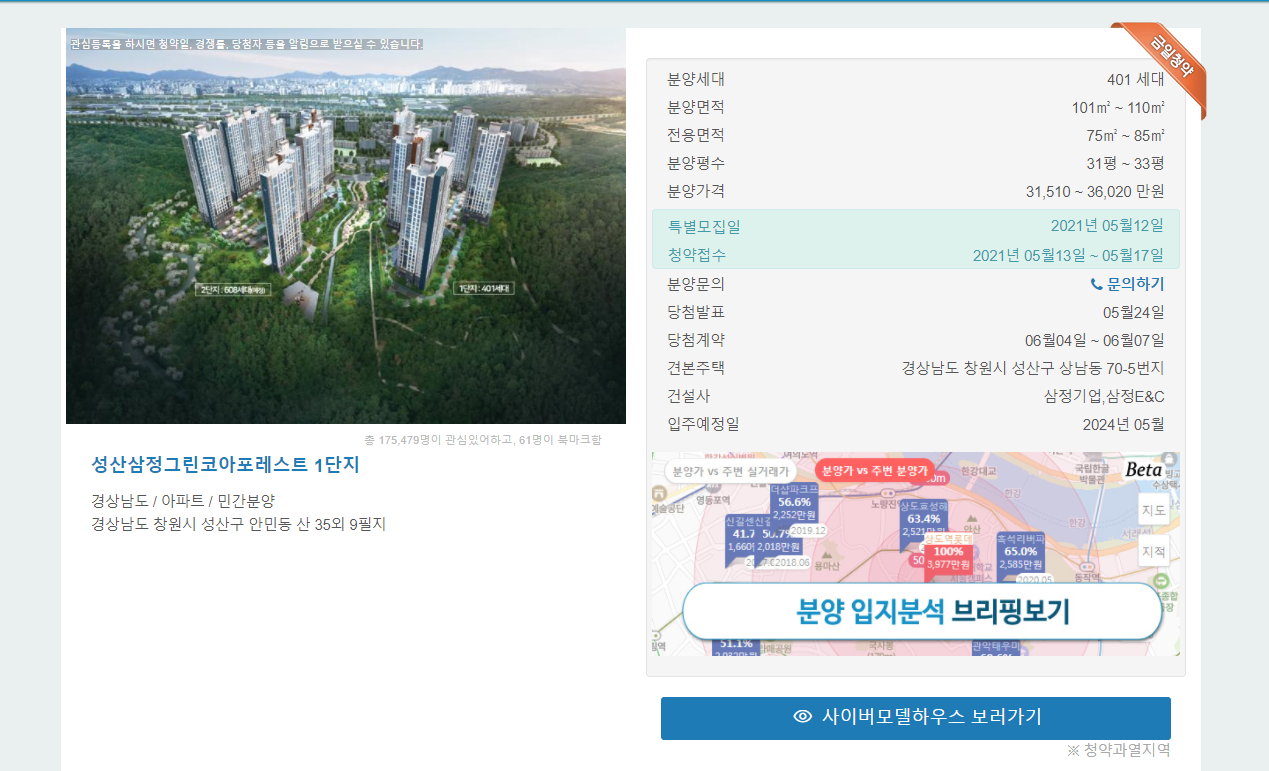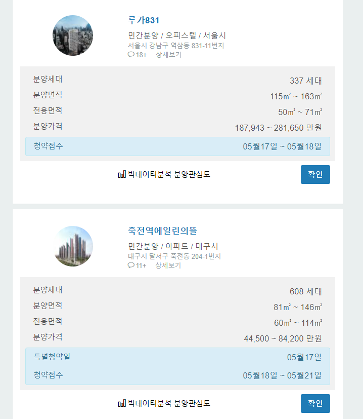 내가 들어가고 싶은 관심있는 부동산 물권을 확인하여 비교하고 금액대나 평수 등에 대해서도 볼 수 있으며, 얼마나 많은 경쟁률이 있는지 치열한지 괜찮은지 등도 비교가 가능합니다. 저도 자주 애용을 하고있는 사이트이며 홈페이지 뿐 아니라 모바일 어플리케이션을 통해서도 확인이 가능합니다.