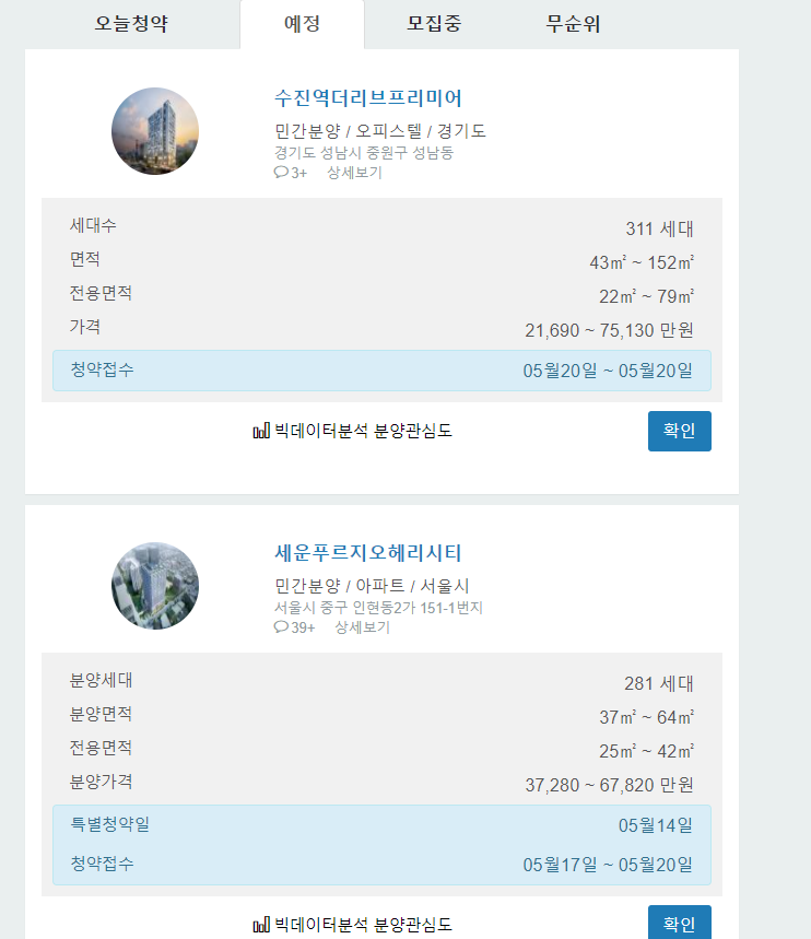 청약을 확인하시기 위해서는 반드시 필수라고 할 수 있겠습니다. 해당사이트에서는 오늘 청약인 곳을 한눈에 볼 수 있으며, 청약이 임박해있는 곳도 볼 수 있고, 그 이후에 모집중이거나 무순위인 청약 부동산들도 확인할 수 있습니다. 또한 내가 원하는 지역을 따로 볼수도 있습니다.