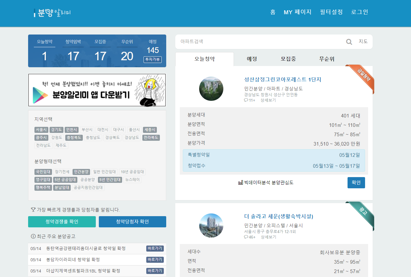 생각보다 많은 분들이 이 청약에 대해서 무지 많은 관심을 가져주고 계시더라고요. 그러기 위해서는 청약에 대한 정보를 알아야합니다. 또한 청약을 빠르게 접수할 수 있도록 한눈에 비교할 수 있는 내용들이 있으셔야 하겠습니다. 오늘 소개해드릴 사이트는 바로 이런 청약을 빠르게 접수하고 확인하고 비교할 수 있는 사이트입니다.