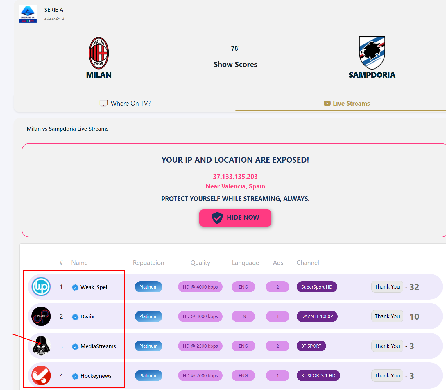 시청하려는 중계 방송 Live Streams을 클릭합니다.