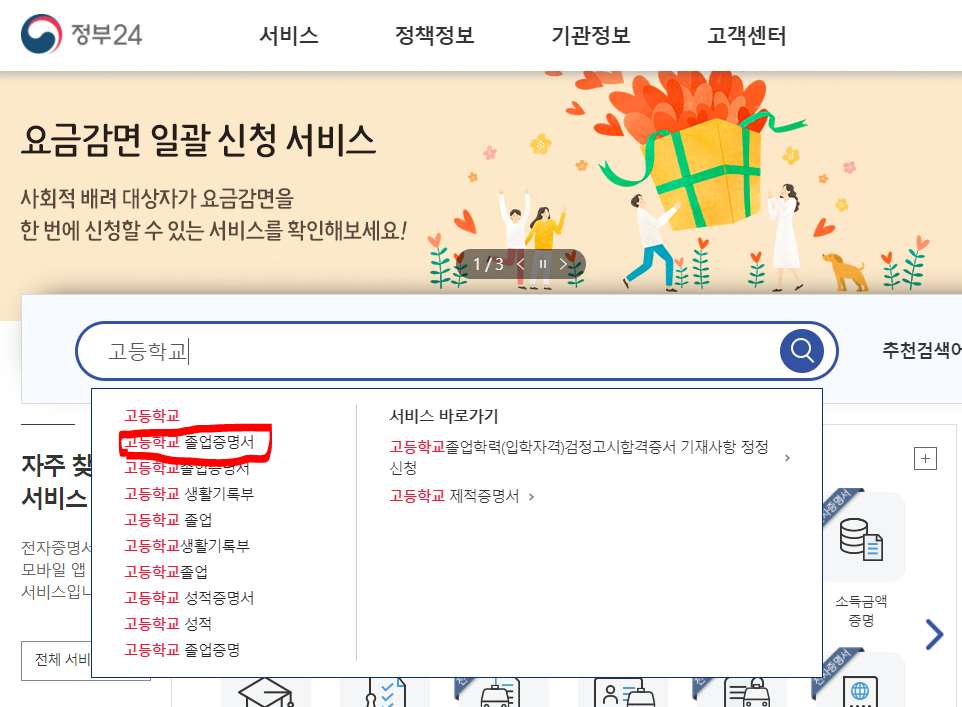 사이트에 들어오신 뒤에는 검색창이 하나 보이실겁니다. 그곳에서 고등학교 졸업증명서라고 검색을 해주셔야 합니다. 자동완성으로 아마 고등학교 졸업증명서 인터넷발급 등이 나올 것입니다. 검색을 하고 엔터를 눌러주시면 초ㄷ중등학교 졸업 증명서와 중등학교 성적증명 등의 내용이 나옵니다. 여기에서 고등학교에 대한 내용은 찾으실 수 없을 겁니다.