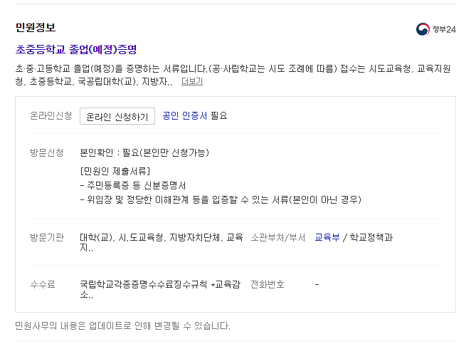 초중등학교 졸업(예정)증명 | 민원안내 및 신청 | 민원24 | 정부24