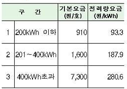 각각 200kWh 이하 사용의 경우에는 910원, 201~400kWh 사용시에는 1600원, 400kWh 초과사용 시에는 7300원을 납부하시게 됩니다.