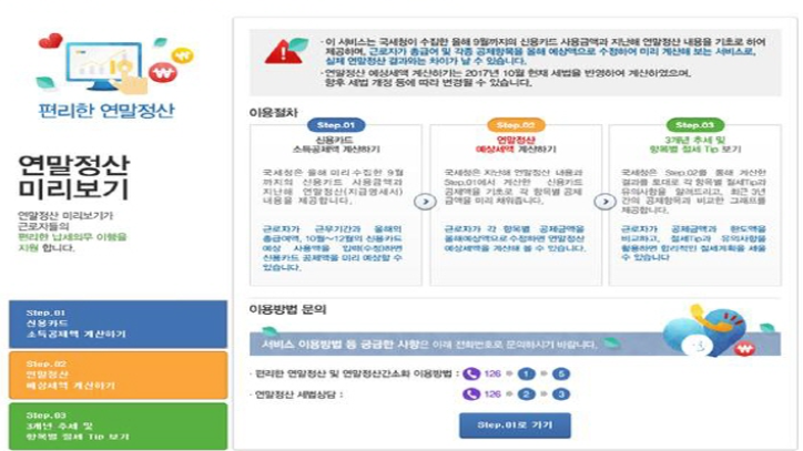 자세한 사항은 우선 홈텍스 홈페이지에서 1단계는 신용카드 소득공제 계산하기, 2단계는 연말정산 예상세액 계산하기, 3단계는 3년 추이 및 항목별 절세도움말 보기로 클릭하여 들어가면 됩니다.