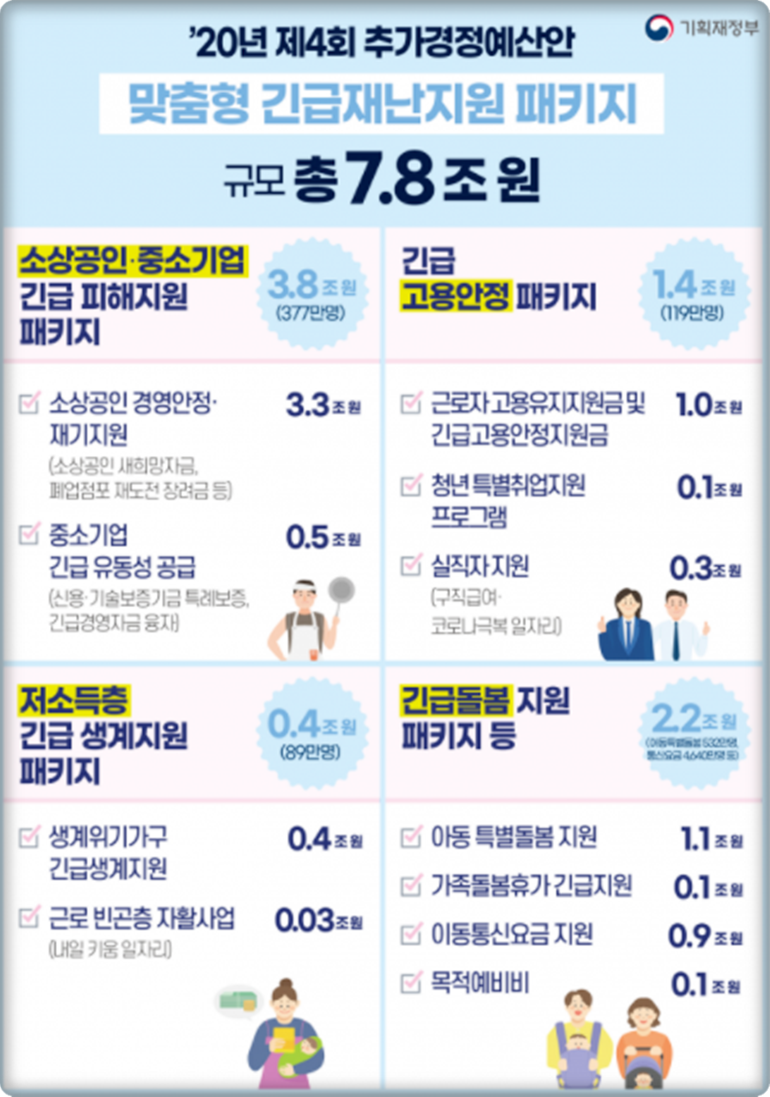 투입된 예산안도 있고, 지급 시점이나 신청 접수할 수 있는 방법도 알아야 할 텐데요. 지난 9월 22일에 국회를 통과하게 된 4차 추가경정예산 맞춤형 긴급 재난지원 패키지라고도 하죠. 이 추경은 전체예산 7.8조원 중 5.4조원을 사업수행기관에 진행하였다고 정부가 공시했다고 해요.