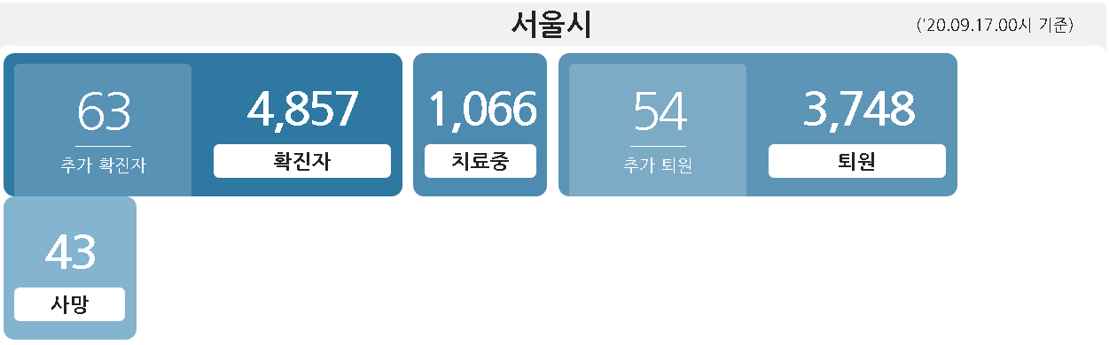 2020년 9월 17일 (목) 기준으로 서울시의 추가 확진자는 63명입니다. 총 확진자는 4857명이며, 치료중인 환자들들 1066명으로 기록되었습니다. 사망자는 43명으로 확인됩니다.
